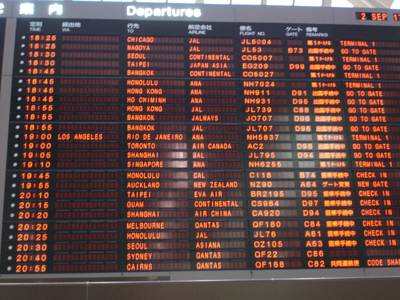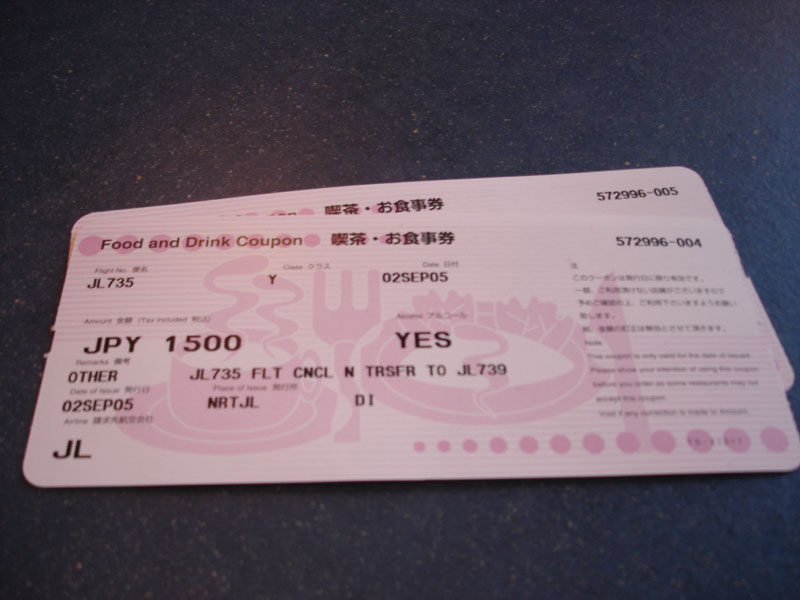モノレールに乗って電車に乗って空港に到着。 JALのカウンターに行くと、乗る予定だった飛行機が欠航になっていたので、その次の便に変更になった。 出発が1時間遅れてしまった…… かわりにJALから空港内のお店で使える、1人1500円分の食事券をもらったのでさっそくそれを使い豪華な食事を。 海の親子丼とビール、計1800円くらいだったが、300円ですんだ。 安い!!