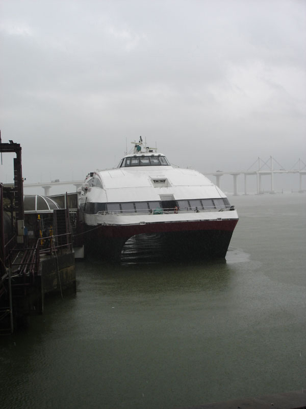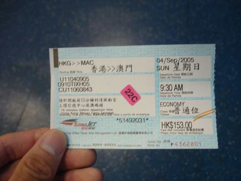 マカオは中国と言っても、元ポルトガル領。 1999年に返還されたが、今では中華人民共和国澳門特別行政区となっていて、一応中国なのだが、マカオに入るのにパスポートが必要だ。 香港出国手続きをしてターボジェットフェリーに乗っていざマカオへ!