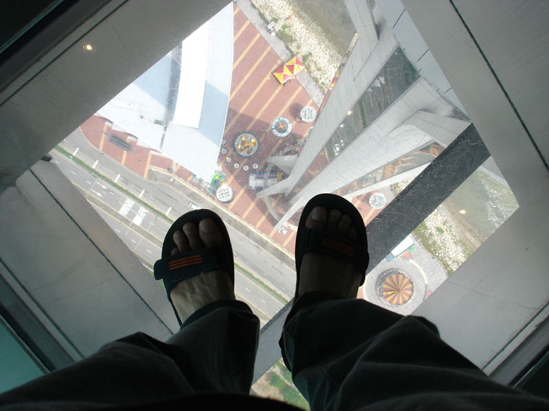 エレベータに乗る。 ものすごい勢いであっという間に展望台に到着。 床の一部が透明になっていて地上まで見える。 割れそうで怖い…… タワーからの景色を満喫して地上に戻る。