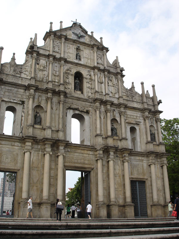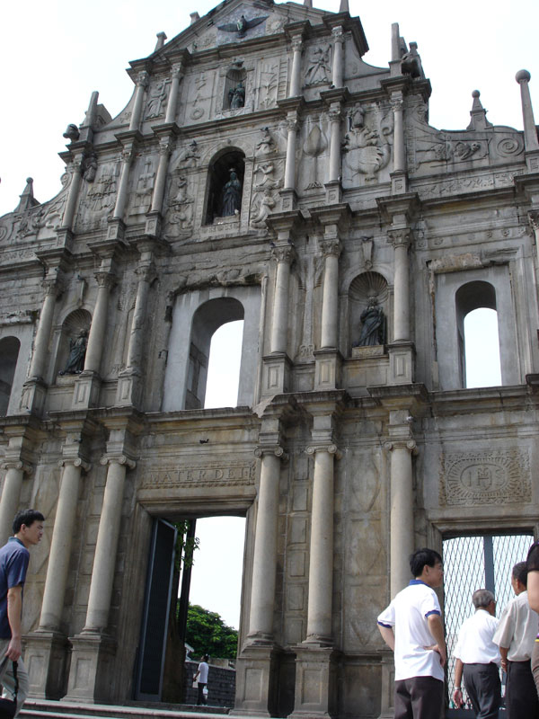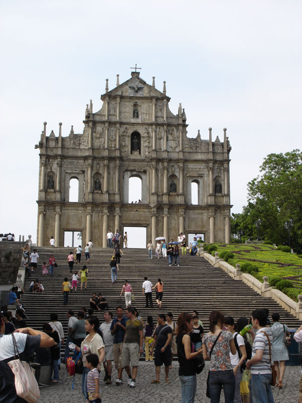 次は「聖ポール天主堂跡」、さっきのモンテの砦のすぐ近くだったから一緒に行っておけばよかった。 「跡」というだけあって建物自体はなく、門のみが残っている。 1800年代に起きた火事で燃え尽きてしまったらしい。 この残されている門がすごい。 映画にでてきそうなものだった。 そして観光客も多かった……