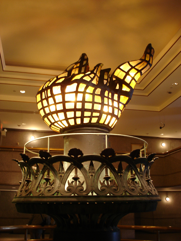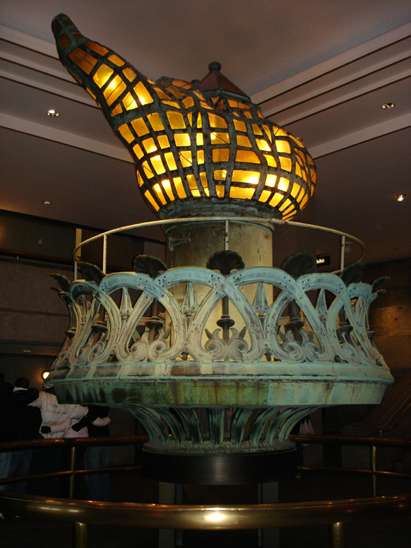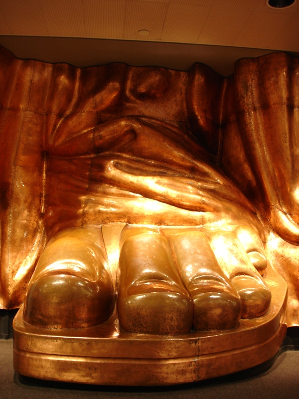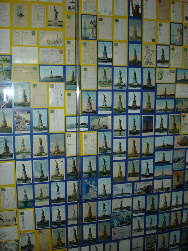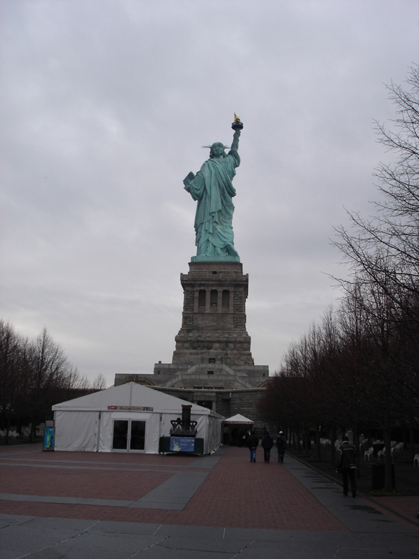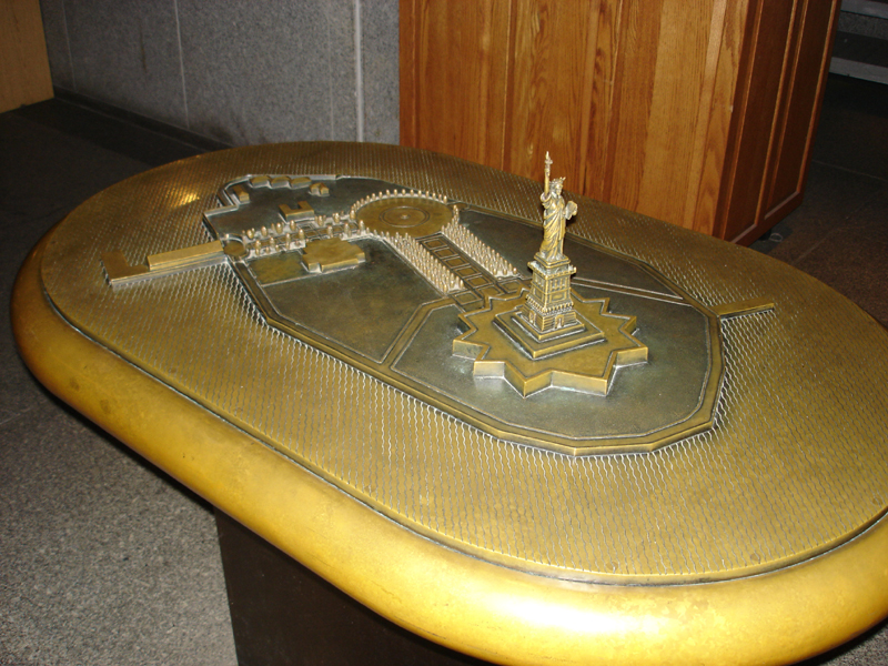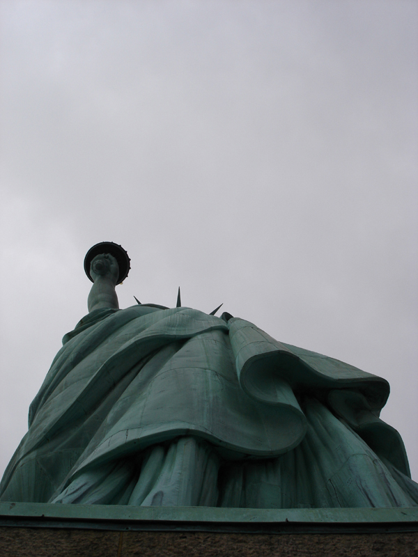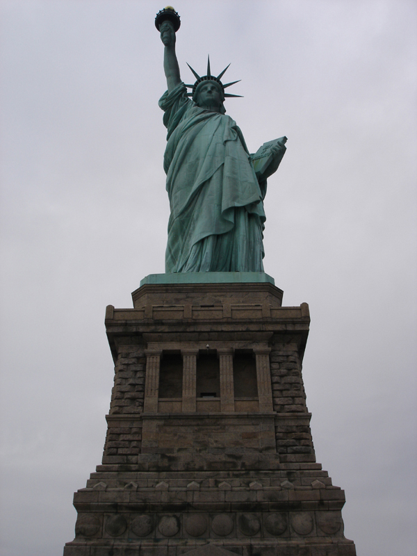 船が自由の女神のある「リバティ島」に到着した。 まず混む前に台座の中に入りたい。 台座に入る前にもセキュリティチェックがあり、手荷物を一切持ち込むことができない。 そのため1回1$のコインロッカーを使用した。 やり方が少しわかりにくくて苦労した。 無事荷物を預けて、セキュリティチェックへ。 左右から空気が噴出される機械があり、風を当てられた。 これは何かの検査なのかな? 金属探知機も通り、ようやく台座のなかへ。 ここでは実物大の自由の女神の足の指などが飾られている。 それと「自由の女神ができるまで」というような写真と絵つきの説明があった。 フランスでつくり、分解してアメリカに運び、また組み立てたらしい。 展示してあるものをじっくりと見て、台座の上の展望台へ。 ここが一番自由の女神に近い場所かな。 真下から見上げた自由の女神はものすごく巨大だった。
