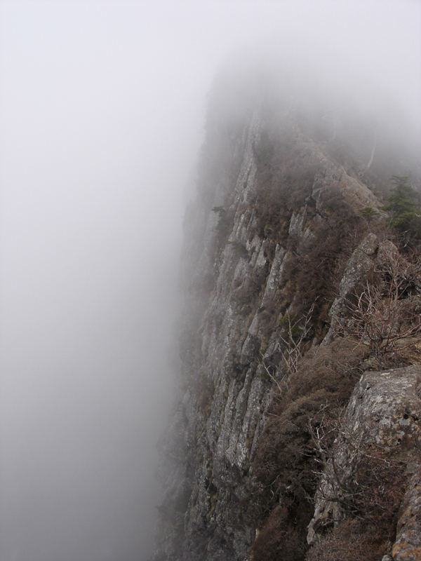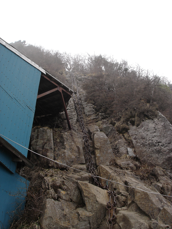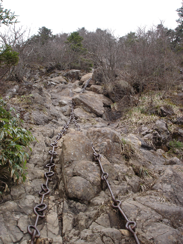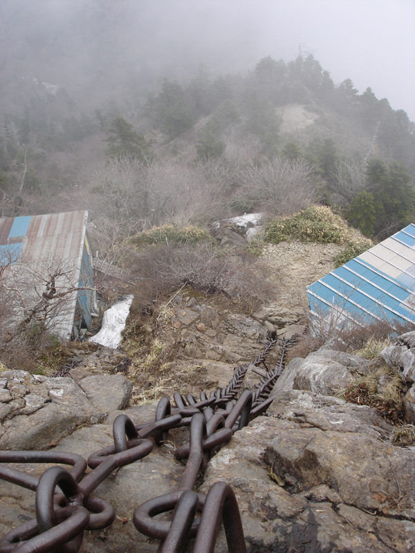 もちろん迂回路もあるけれど、今日はこれを登るのが目的でこの山にきたからやらなくては。 鎖を登ることや、高さは全然怖くないが一つ不安な事が。 それは鎖を繋いである支点がどうなっているのか。 1つの鎖の重さが4kgほど、長さが40cmくらいなので……6000/40*4=600 それが4本くらい下がっているので2.4トンもの重さがかかっている。 きちんと鎖が落ちないようになっているのだろうか。 それだけが不安。