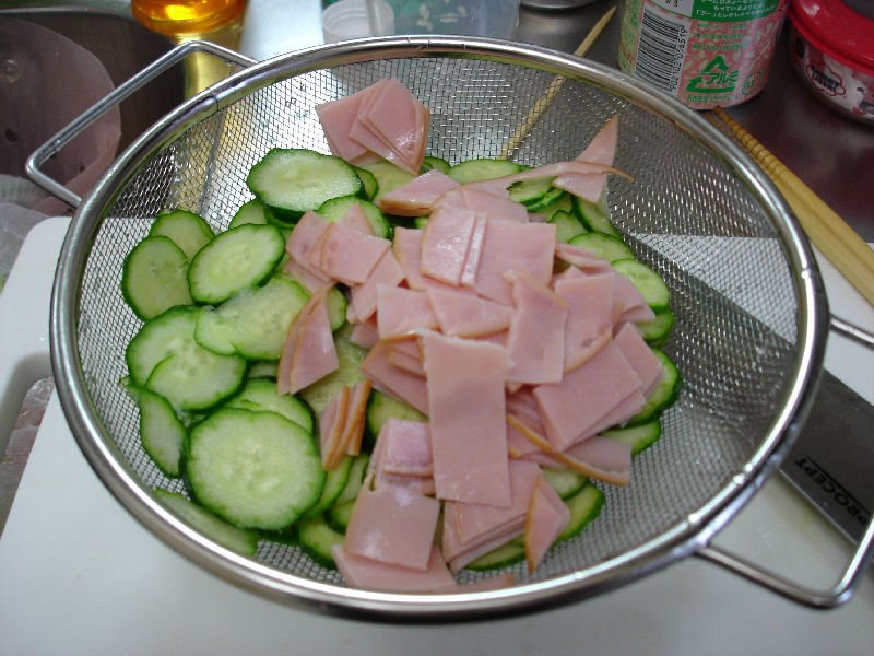 きゅうりとハムも切って、じゃがいもを煮てほぐして混ぜて完成!