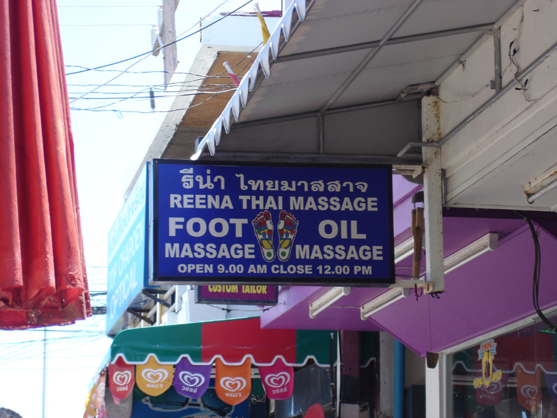 プールを満喫したあと、街に繰り出す。 とりあえず、ホテルをでてすぐ南に行ったところで、マッサージをしてもらう。 対マッサージが1時間でなんと200バーツ。 日本円で740円ほど、安い! 2階の薄暗い部屋に案内されて、マッサージを受ける。 けっこう気持ちよかった~♪