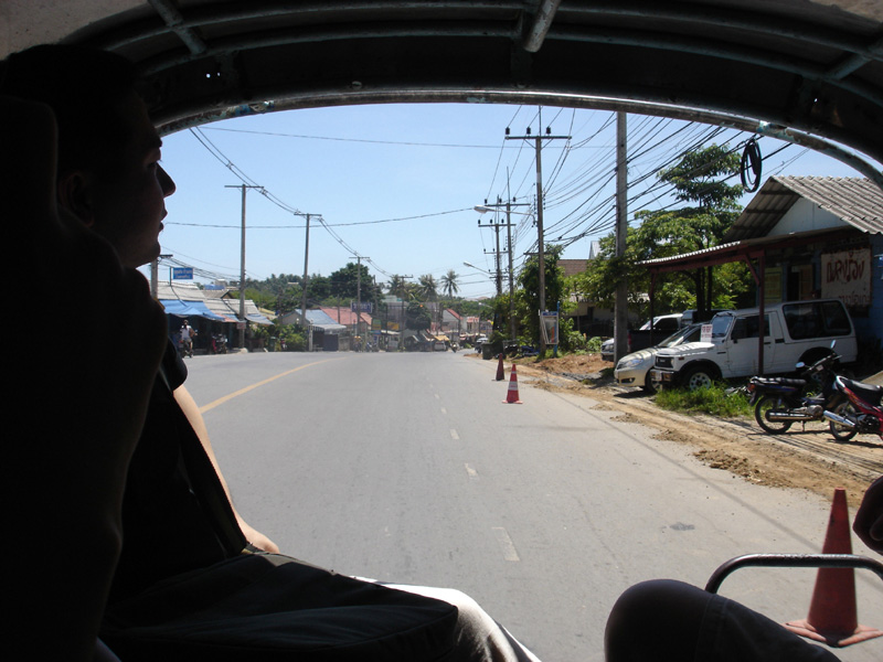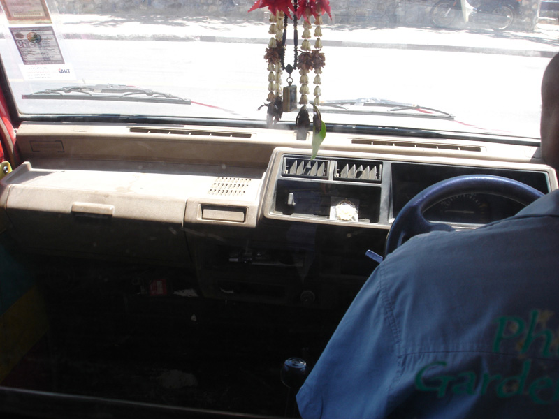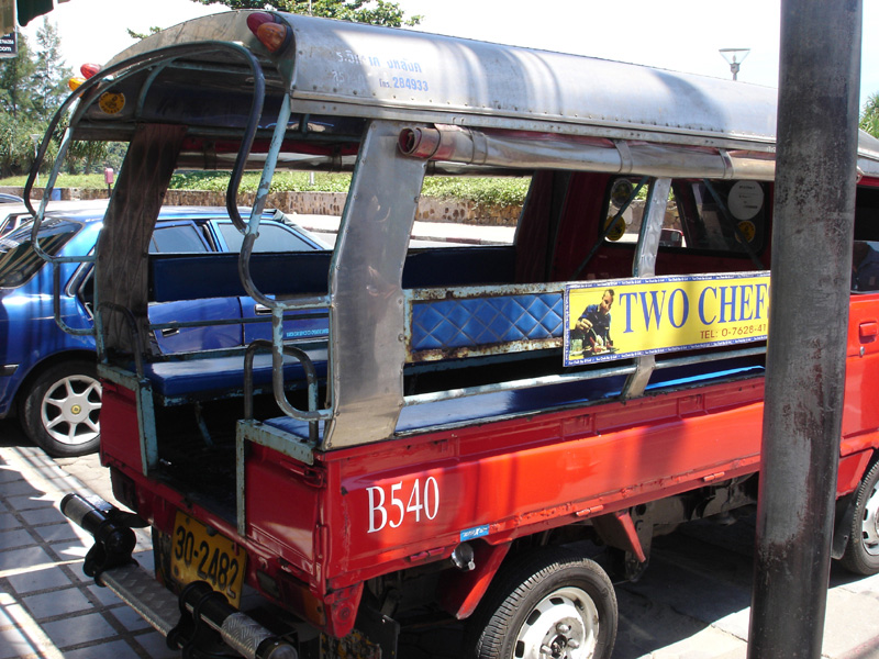 それからトゥクトゥクという軽トラをタクシーに改造したものに乗ってプーケットタウンに行く。 最初「7人で500バーツだ」と言って来て、「400バーツにまけてよ」と言ったけど、「7人もいるんだから」と断られてしまった。