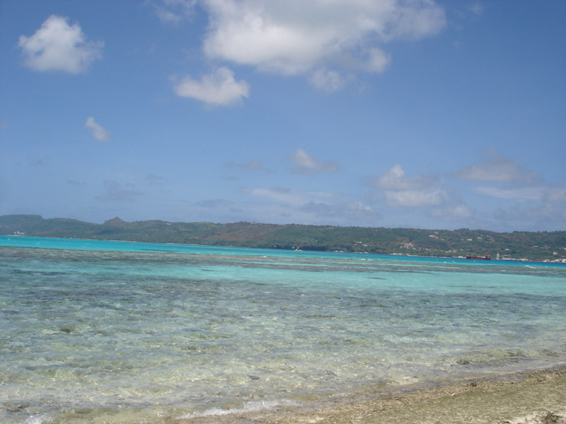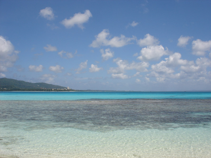 海は水色と黒の斑模様。 黒い部分は岩があるのだろう。 すごい真っ青な海。 綺麗。