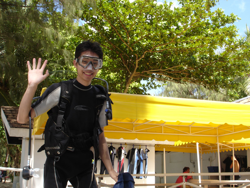 慌ててダイビングの所に行って、ウエットスーツを着た。