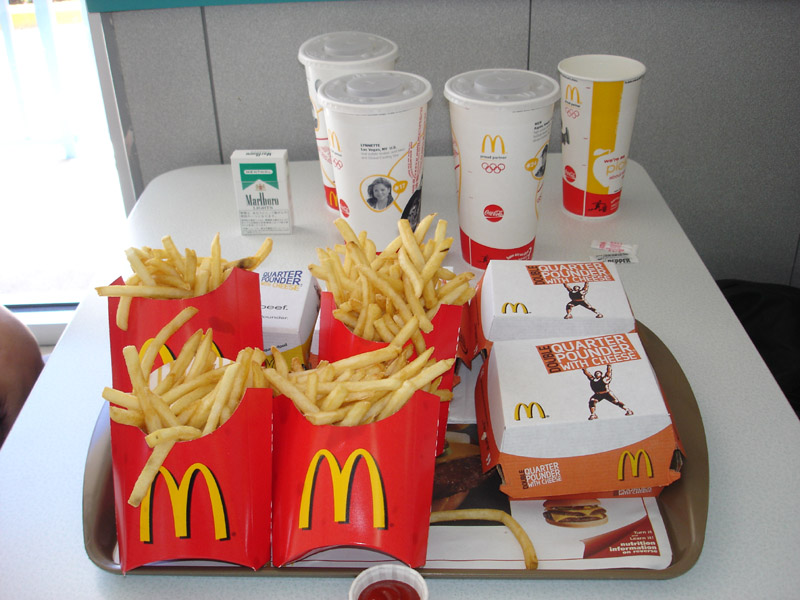 超巨大ドリンクと、巨大ポテトとハンバーガーを食べる。 アメリカは全てのサイズがでかい。 ハンバーガーは普通サイズだけど、ポテトもでかいし……