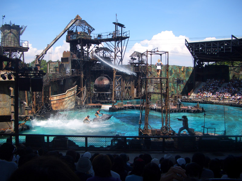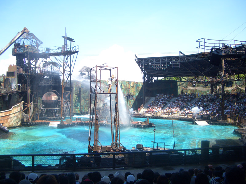 次は「ウォーターワールド」。 ショーであまりいい席は取れなかったけれど、ほとんど待たないで入れたのでいいか。