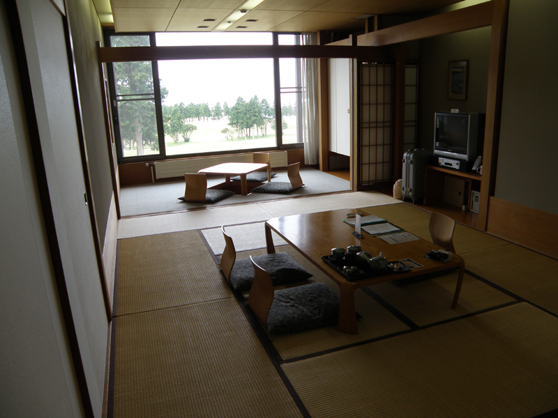 チェックインをして部屋に通されてビックリ。 部屋でかっ! 12畳+4畳らしい。 目の前はゴルフ場。