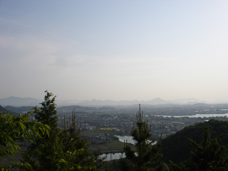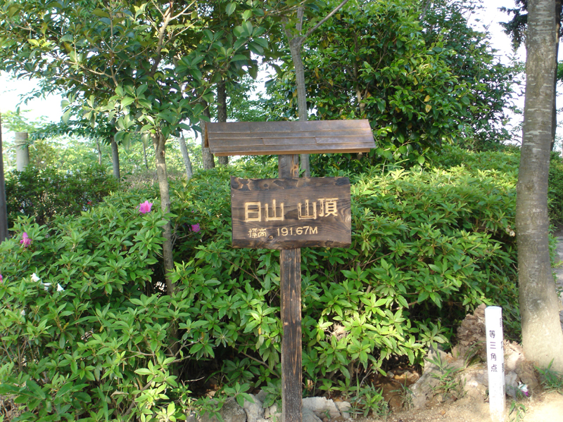 雨山を下山して、そのまま日山へ。 ハイキングコースと、山道を歩くコースがあって、とりあえず山道を歩くコースで登っていった。 こちらも15分ほどで山頂へ。