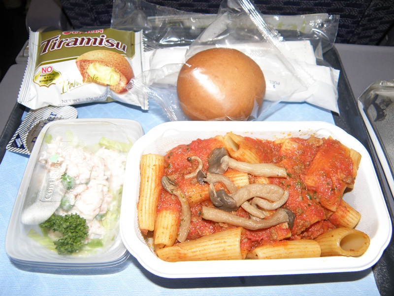 離陸してすぐにご飯になった。 「チキンカレー」か「パスタ」で、パスタを選んだ。 意外に量があり、お腹いっぱいになった。