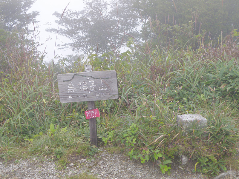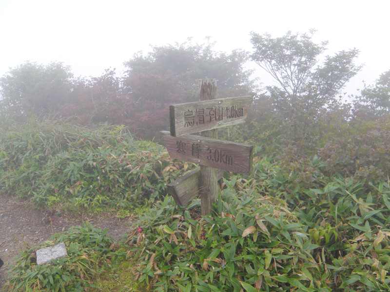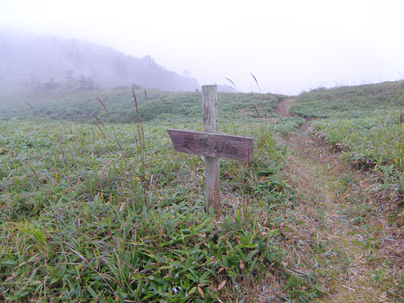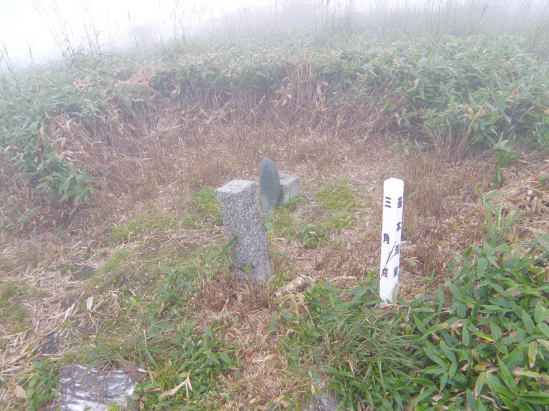 天気はメチャメチャ悪い。 ガスも出ていて全然景色も見えない…… しかも寒くて耳が痛いし…… そんな中歩き続けて「落禿」に到着。 三角点があるだけだった。