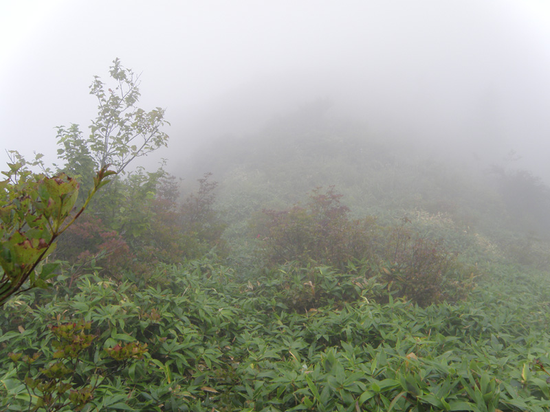 一瞬でズボンが濡れてしまったので、レインコートの下を装着。 少し歩いていたら、笹が胸くらいの高さまで深くなってきたので、レインコートの上も装着。 笹地帯を抜けたあとはひたすら登り。 ガスで上が全然見えないので、どれくらい登るのかが全く分からない…… 山用のレインコートじゃないので、蒸れて暑い……