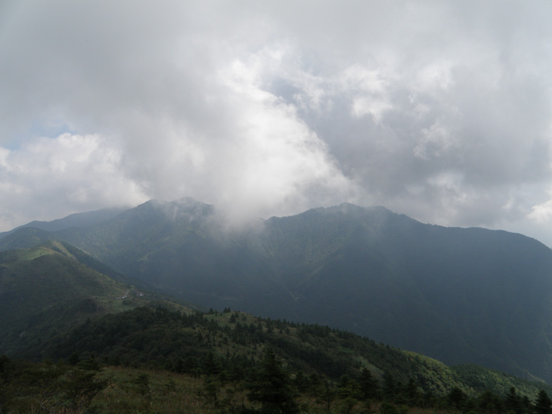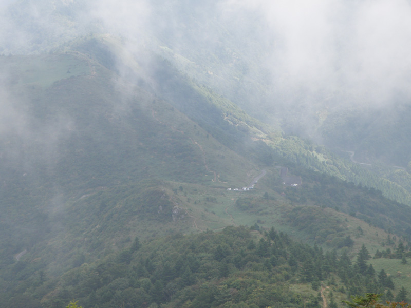 前烏帽子山を通り抜けて、落禿を通過したあたりで、太陽が出てきた。 ガスも微妙に晴れ間があって、落合峠が見えた。