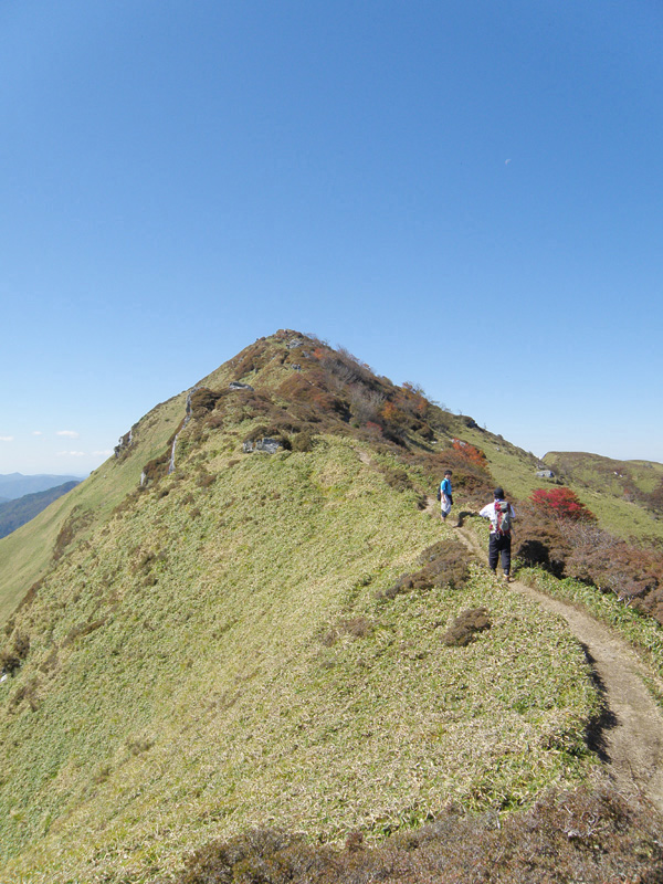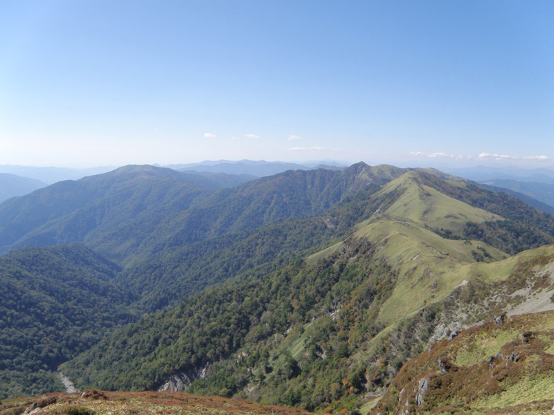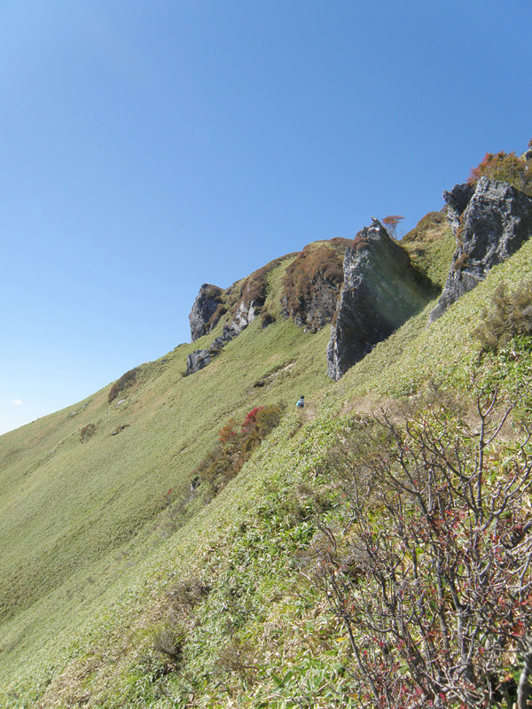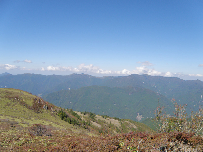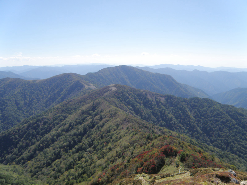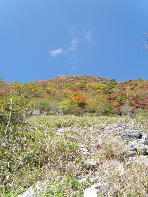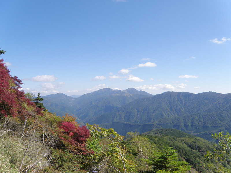 少し歩いたら森林地帯を抜けて、とても景色のいい場所にでた。 上を見上げると赤く色づいた木々と岩が見える。 左手には剣山への縦走路、後ろを振り返るとはるか遠くに剣山が!
