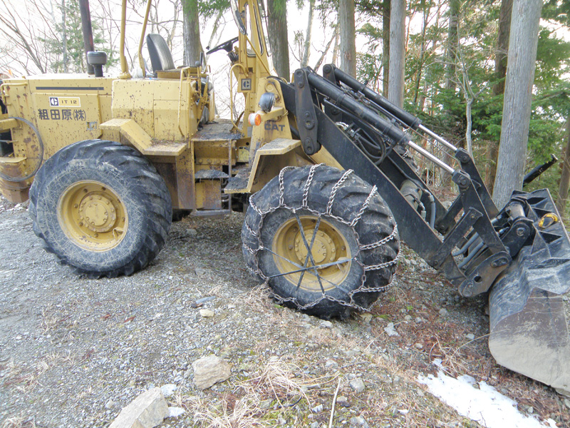 その直後、林道に合流するのだが、除雪車代わりに使ったとみられる重機が。 そしてタイヤには超巨大チェーンが。
