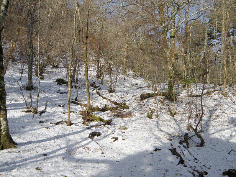 ここから誰も歩いていないだろうルートに入っていく。 日中も日蔭らしく、さらさらの雪が残っていた。