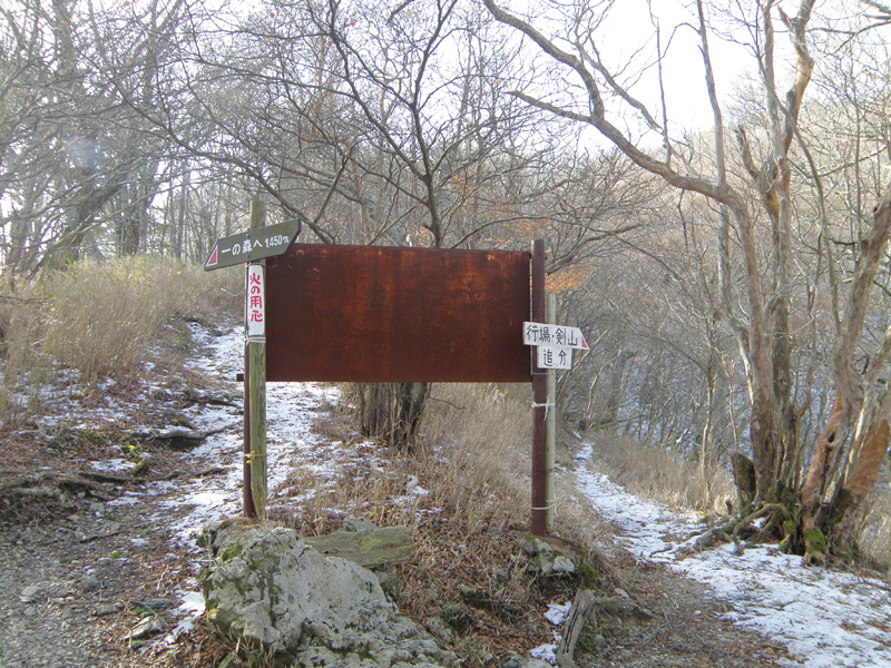 しばらく歩き追分に到着。 足がだるく、右膝が痛い。 ここから、コースタイムで90分の下りで駐車場だ。 このルートで最も急な箇所だ。