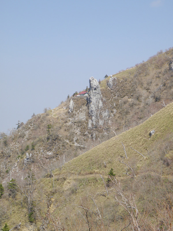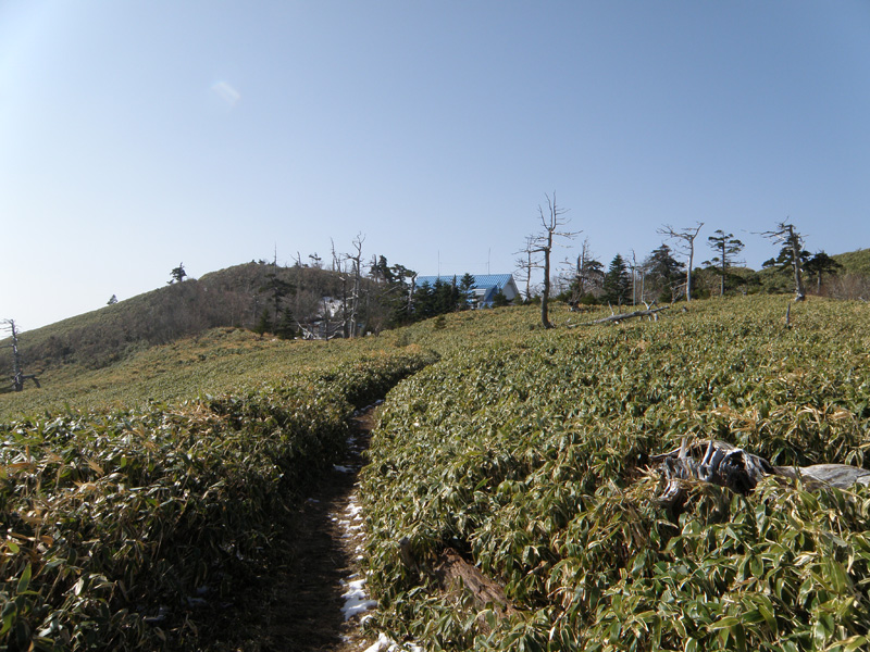 しばらく歩き、樹林帯を抜けて笹原に出たら、ヒュッテはすぐ近く……と思っていたのだが、笹原に出てから15分くらい歩いたな… ようやくヒュッテが見えてきた。