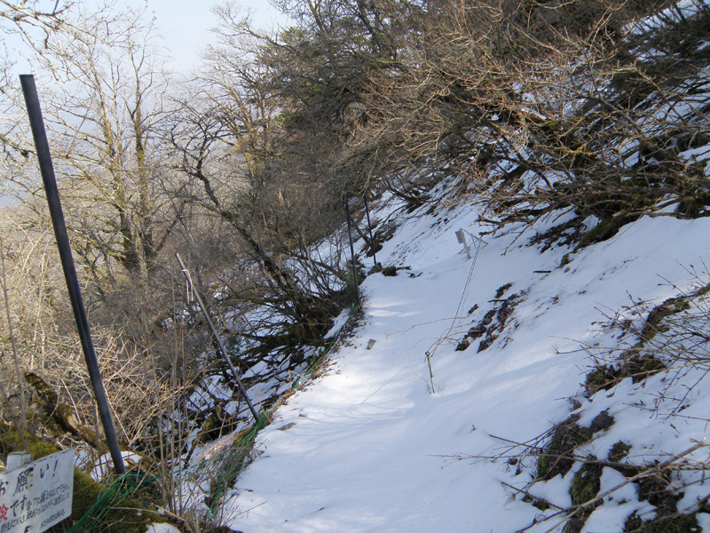 しかたない、ラッセル時以外は使わないようにしていたストックを使って、膝の痛みを和らげながら歩くか。 登りは苦だった雪も下りは、スピードを出すのにちょうどよい。 ストックも膝をカバーしてくれるので、思ったより早く神社まで降りてこられた。
