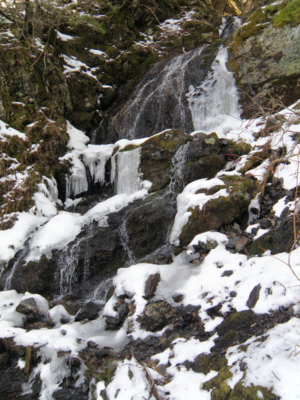 少し斜面を登ると、辺りが一気に白くなった。 火曜か水曜に降ったとみられる雪だね。 しかしシャーベット状でとても歩きにくい。 体重をかけると、辺り50cm四方くらいが崩れる。
