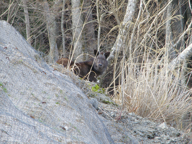 神社から林道を歩いていると、正面の斜面から何かがオレを見ている……見た瞬間はイノシシかと思った。