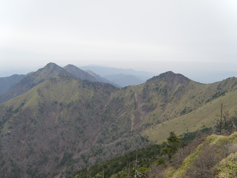 帰りも同じルートを下っていく。 先ほどの笹原の道、山頂からもとてもよく見える。 この気持ちいい道を愛媛大学小屋まで下る。