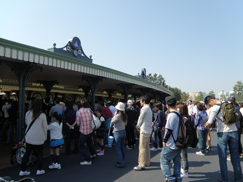 入場券待ちをして、まずは「プーさんのハニーハント」のファストパスを入手しに。 しかしファストパス待ちの列が… 30分とかいてある… ファストパスを取るだけなのに、そんなに待つのか… 15分くらいでファストパスは取れたのだが、指定時刻が16時10分~17時10分。 今の時間はまだ9時前。 相当混んでいるのか。