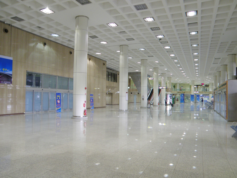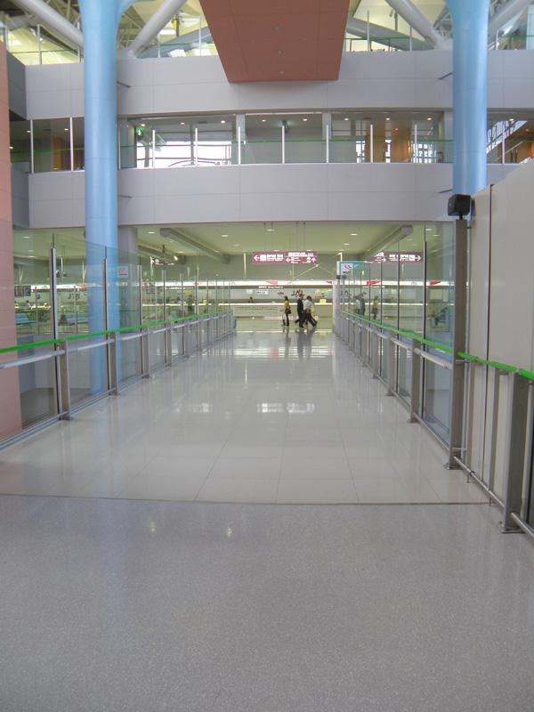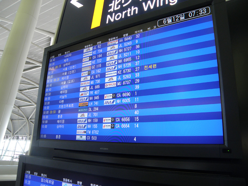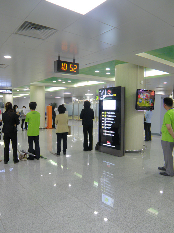 初めての韓国なのに、初上陸は雨。 荷物を受け取り、空港ロビーに集合。 少し時間があったので、待機していたのだが、空港を警備する警察の装備がすごい。 胸の前には大きなライフルを構えている。 そして2人組で行動している。