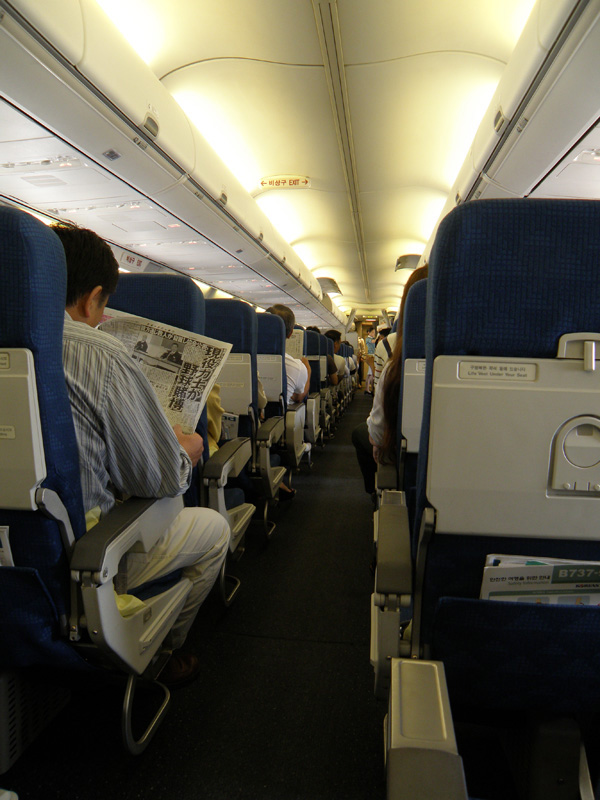 今回の航空会社は「大韓航空」。 初めて乗る航空会社だ。 飛行機は1列6人の小さな旅客機。 済州島まで、1時間40分だって。 東京に行くのとほとんど変わらない時間で韓国に行くことができる。