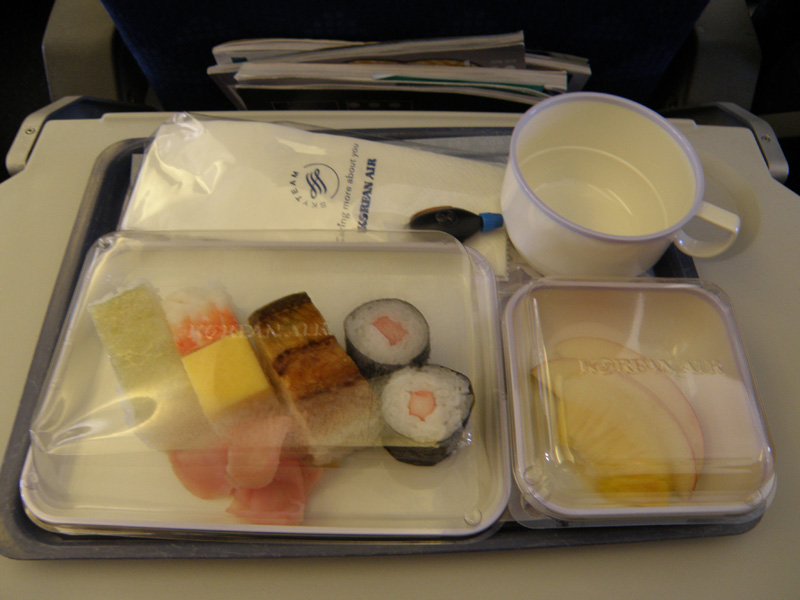 機内食は寿司が出た… 最後の日本食ということで、夕べ食べてきたのに… やっぱ飛行時間が短いと、機内食もしょぼくなるのだろうか?