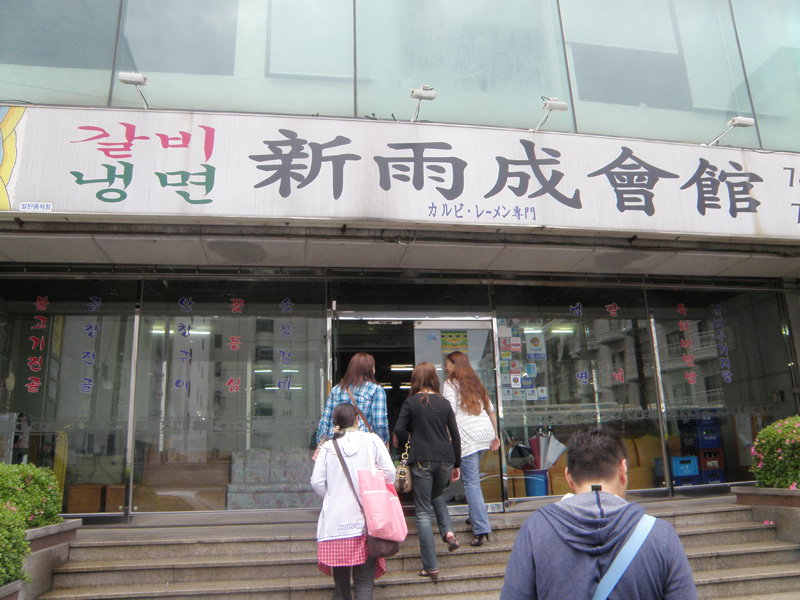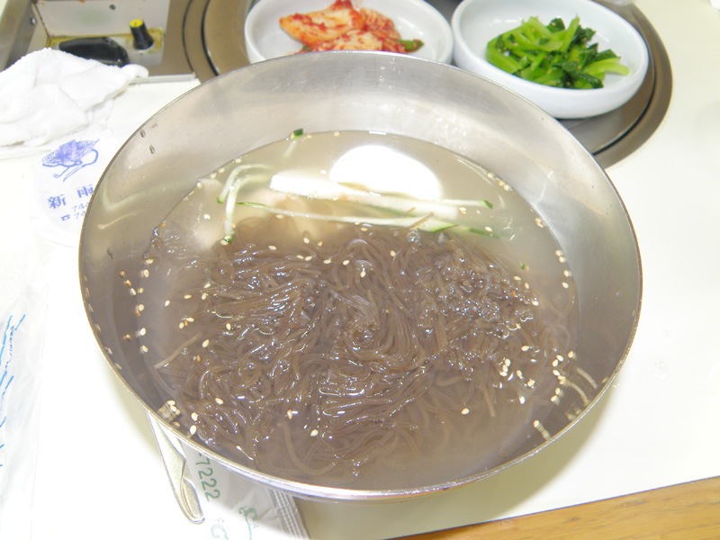連れていかれたお店は、韓国冷麺のお店。 日本で食べるあの味の、本場の味だと思って期待していたのだが……出てきたのは色の付いていないスープに、糸こんにゃくみたいな麺。 食べてみたが……味がほとんどしない。 そして美味しくない。