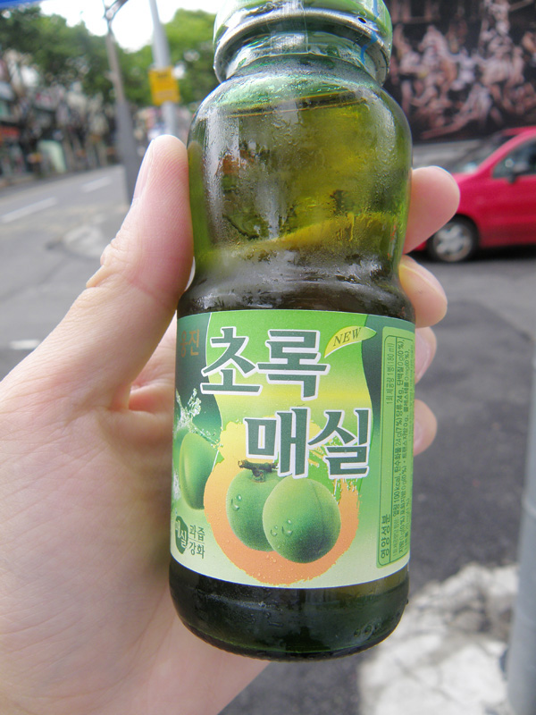 集合時間まで少し時間があるので、済州の町をブラブラと歩いてみることに。 まぁ歩くっていっても、半径200mくらいのところだけだけど。 そして初めての買い物に挑戦。 入ったお店はおなじみのコンビニ、ファミリーマート。 店員は思いっきりiphoneで遊んでいた。 ハングル語で書かれた謎の梅ジュースを購入。
