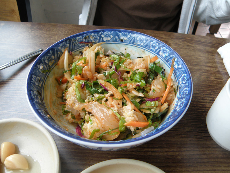 そして料理がやってきた。 海鮮丼はコチュジャンみたいな、赤いものを大量にかけて混ぜるらしい…