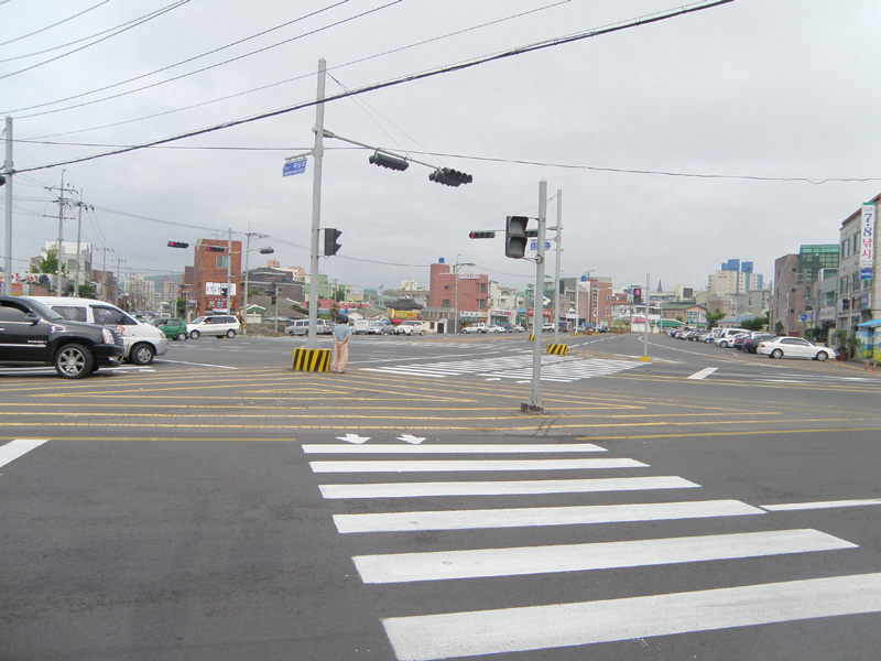この付近をブラブラ歩いてみるか。 適当に歩いていたらでかい交差点が。 韓国の交差点は渡るのが怖い。 普通に車が突っ込んでくるし、歩行者信号は3秒くらいで点滅が始まるし。