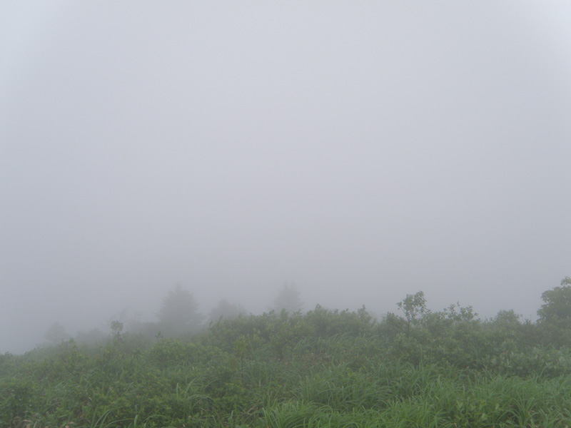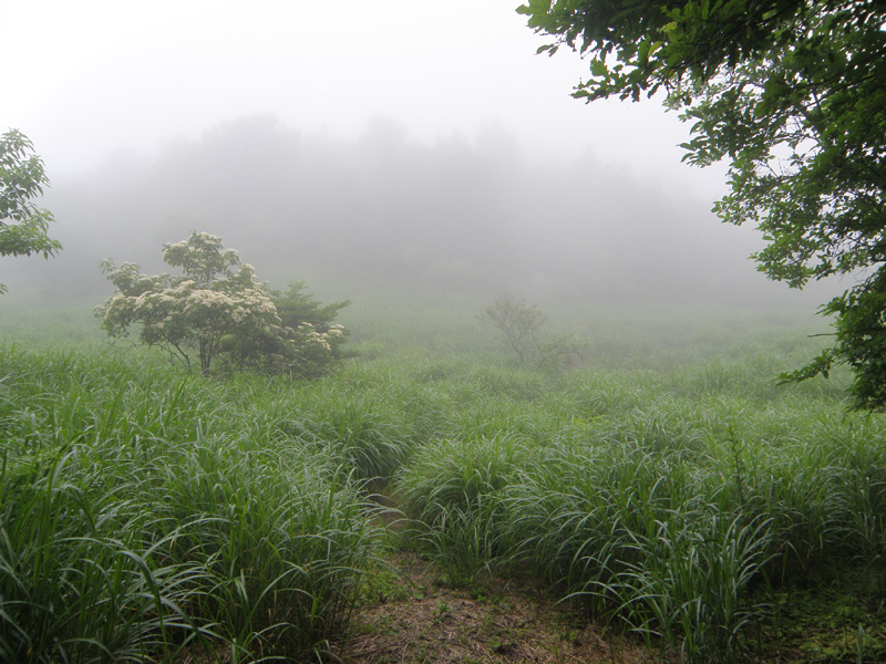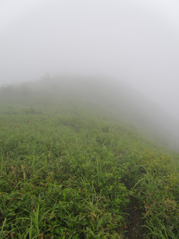 尾根なので風が強い。 風が強いと雨粒が大量に落ちてくる。 しばらく歩き、一面の草原地帯に出た。