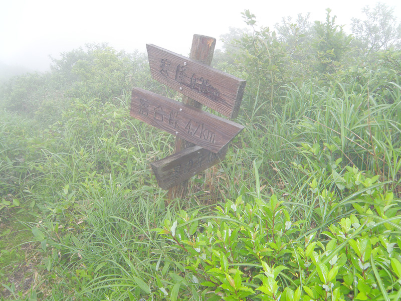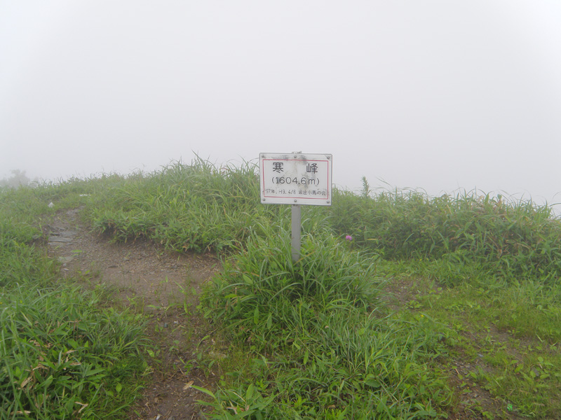ガスがかかっていたが、反対側に「寒峰」と書かれた、幅1mほどの巨大な看板がある。 手前には「登山道」と書かれた、巨大な看板がある。 迷うのだろうな、ここ。