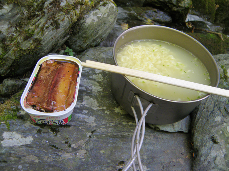 インスタントの塩ラーメンの中に切り餅を入れたものと、サンマの缶詰も食べる。