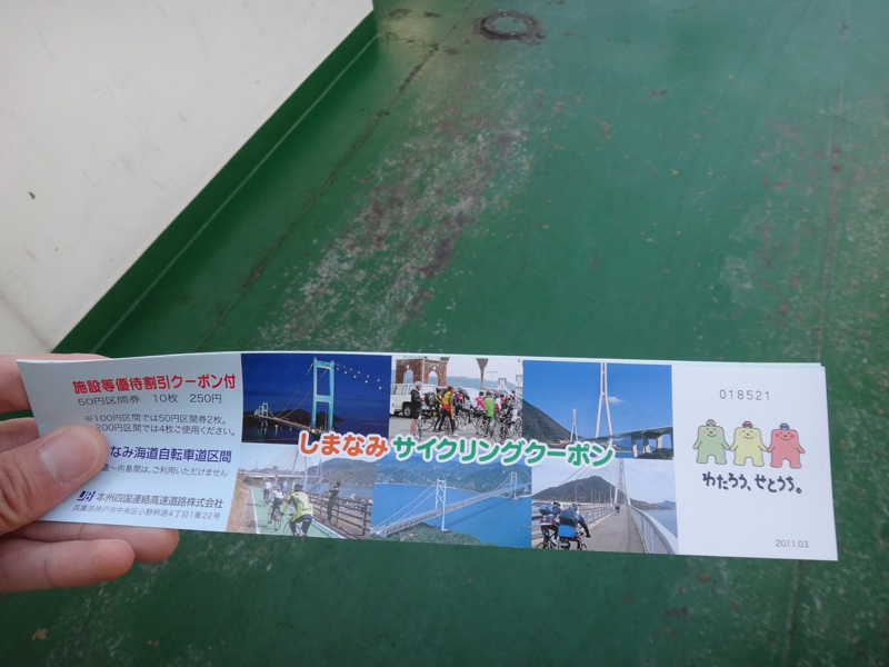 これから渡るしまなみの橋は、それぞれ通行料金がかかる。 自転車・原付だと全て渡ると500円かかるのだが、500円分の通行チケットが250円で売っている。 これをレンタルサイクルを借りる際に買っておいた。