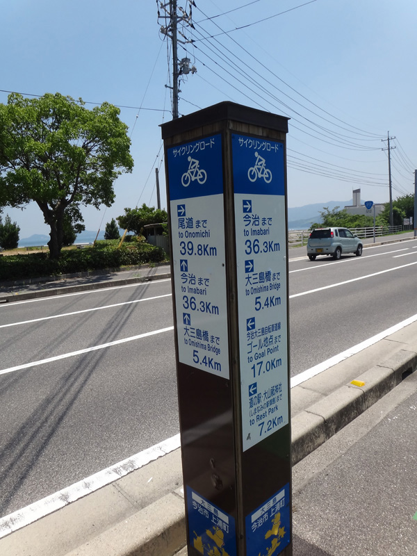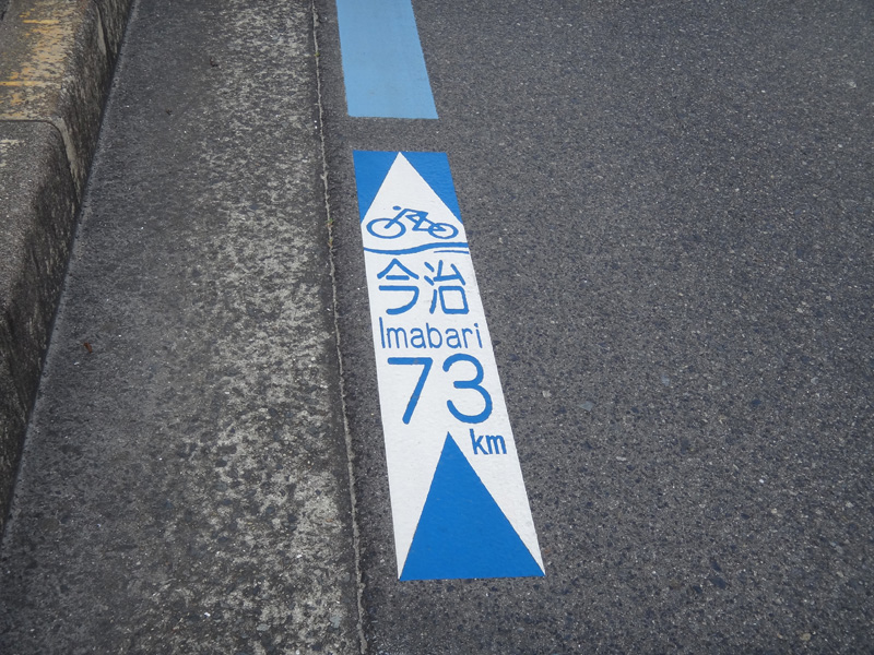 地面には「今治73km」の案内が。 この青い線に沿って走って行けばいいらしい。