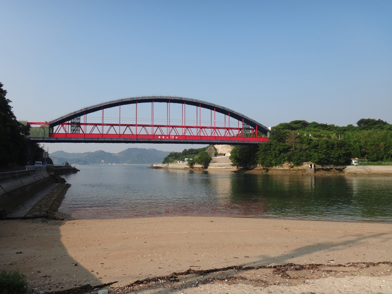 向島を走っていると、赤い橋が見えてきた。 「岩子島」という島に渡ることのできる橋みたい。 これは渡ってみるしかないな。