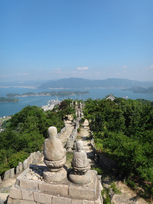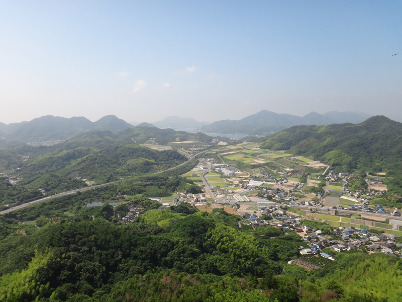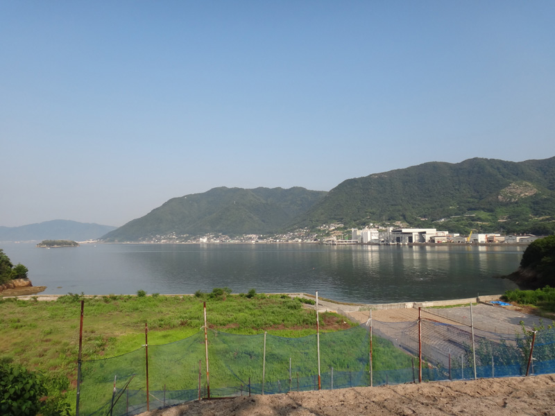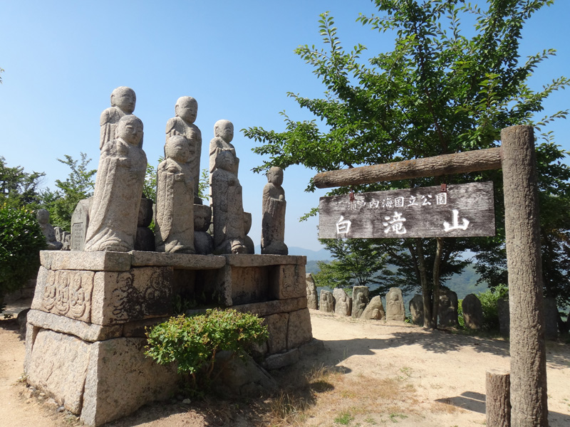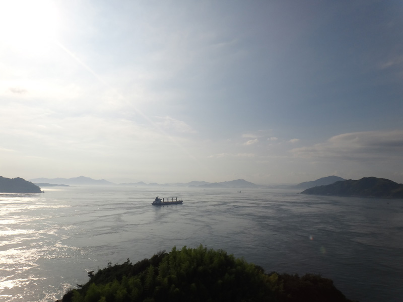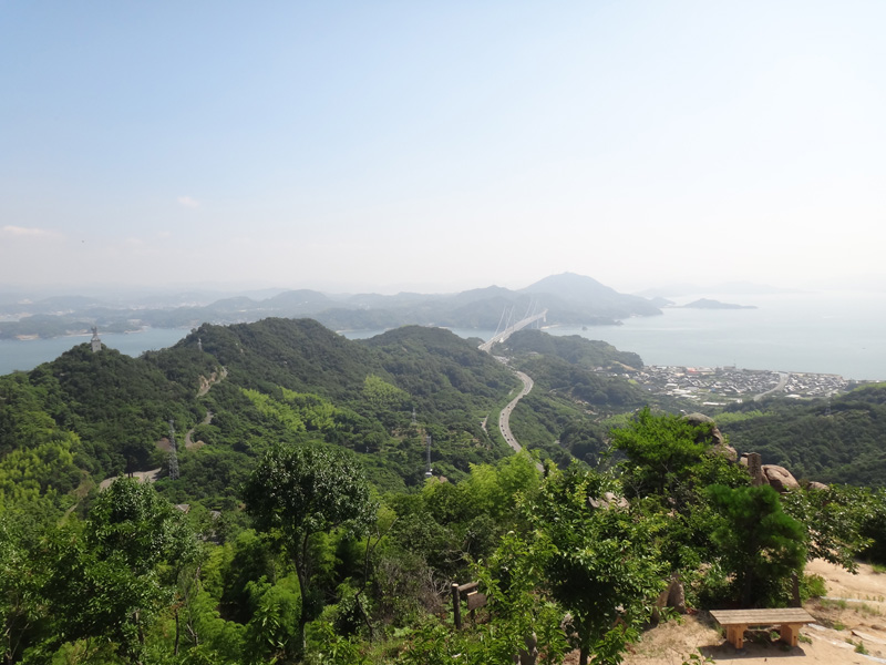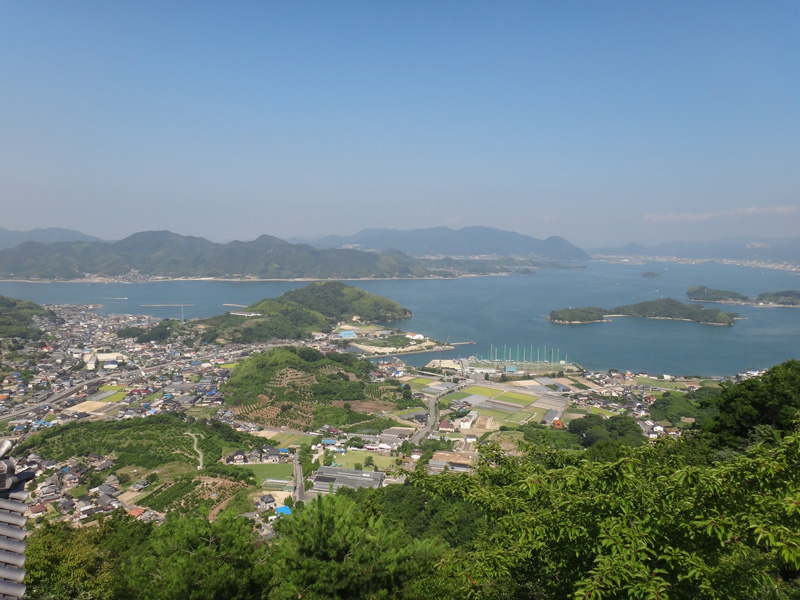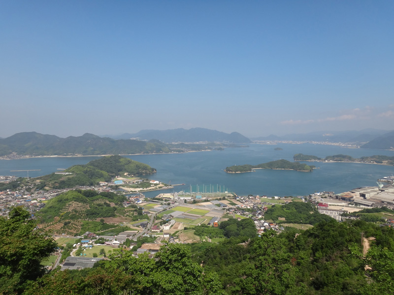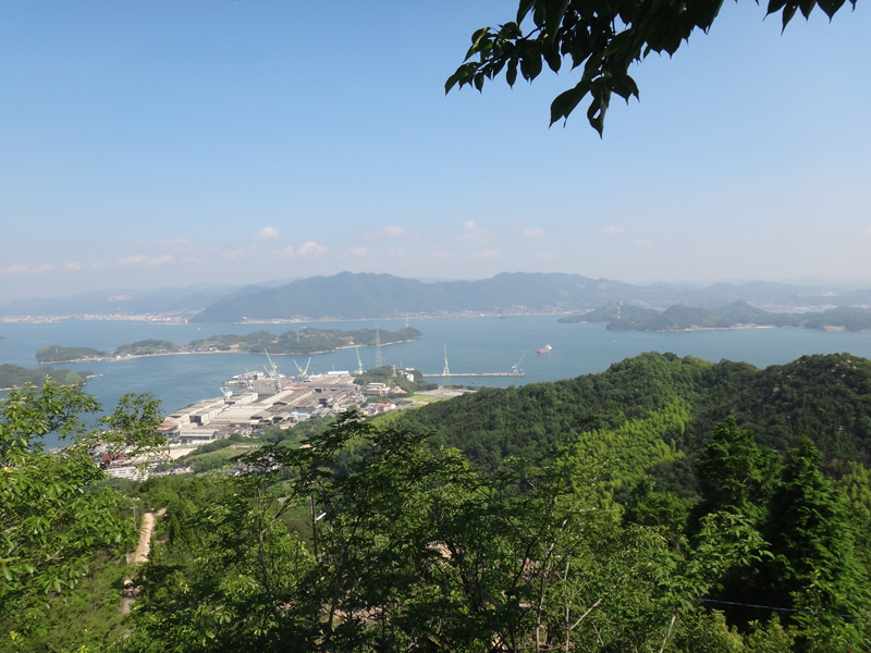 白滝山には展望台があったので、そこから景色を眺める。 青空に青い海、緑の島々が美しい。 美しすぎる。 景観を壊すような工場があるけど、微妙に溶け込んでいるようにも見える。