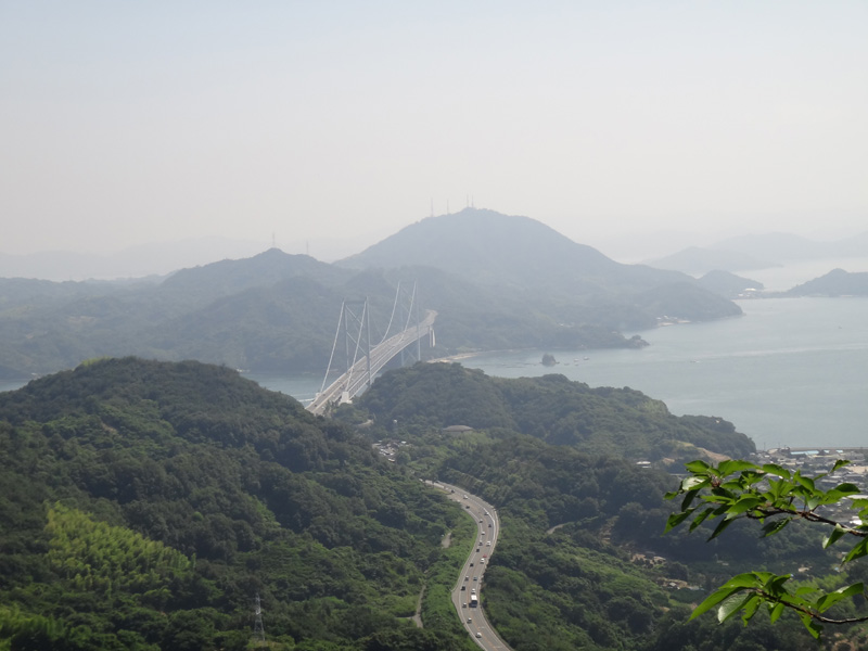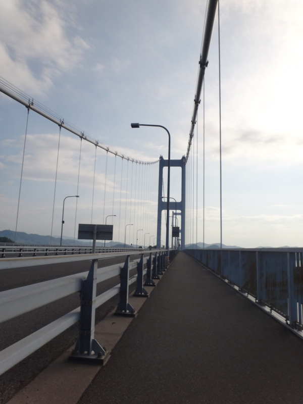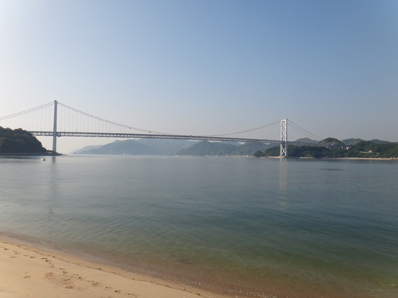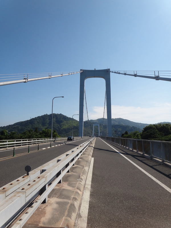 大島はアップダウンがけっこうつらく、写真がほとんど無し…… 今治へと繋がる、来島海峡大橋が見えてきた。