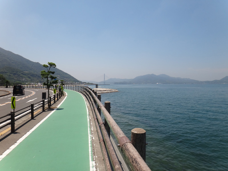 生口島は抜けるのに最短距離でも10km以上かかる。 ようやく長い距離走れる島だな。 海沿いの気持ちいい道を走る。 ヘルメットかぶって、速そうな自転車に乗った人たちが、オレをあっという間に抜かしていく。