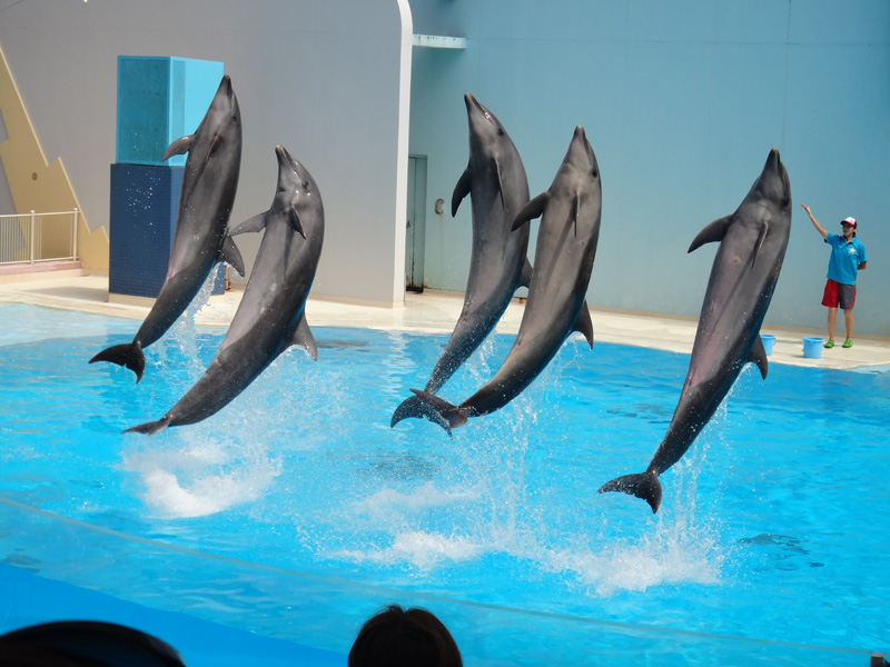 暑い中イルカショーが始まった。 5匹同時ジャンプや、宙返りなどをこなす。 いつも思うのだけど、どうやって技を教えてるのだろう。