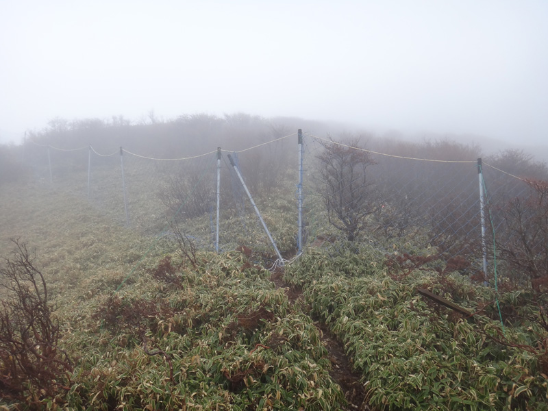 少し下って、再び登りへ。 鹿よけネットを通過し、三嶺ヒュッテが見えるところまでやってきた。 こっち側は風がすごい。 とりあえず、先に山頂まで行こうか。