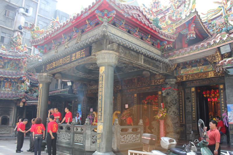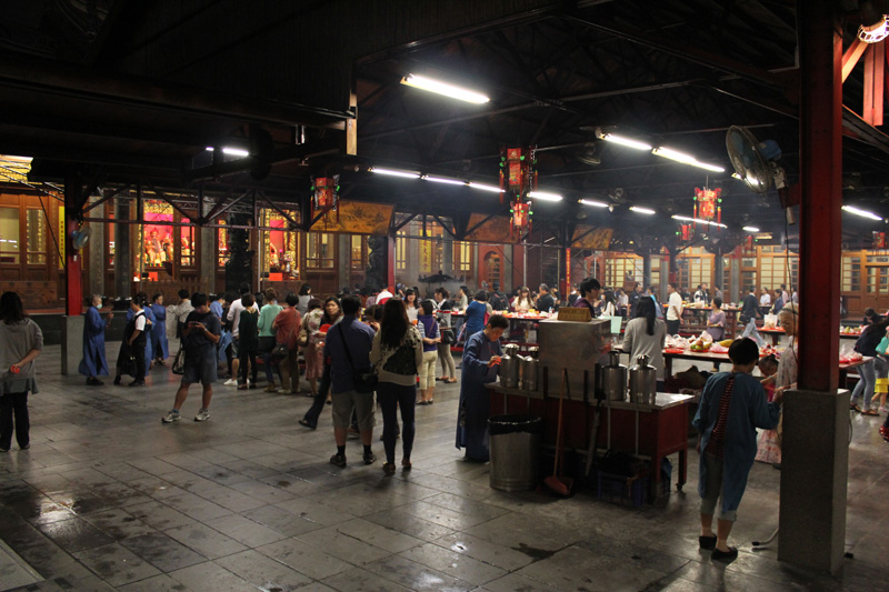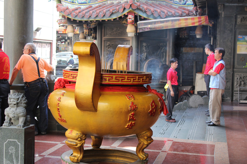 中に入ったらビックリ、かなりの人が熱心にお参りしているではないか。 線香を頭の上に掲げて目をつぶり祈りをささげ、赤い2つに分かれた小さな物を地面の上に放り投げる。 表裏があるのかな? 投げたものを拾い上げ、また投げる。 皆、何度もそれを繰り返している。