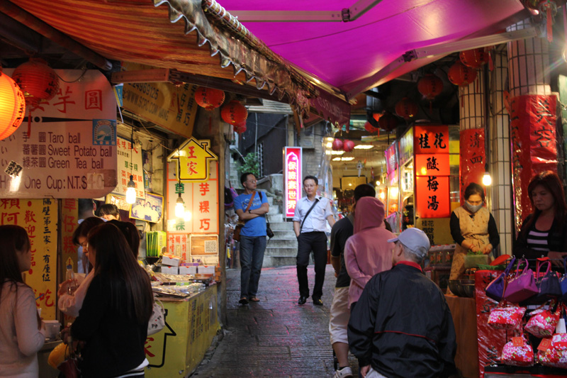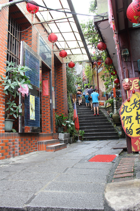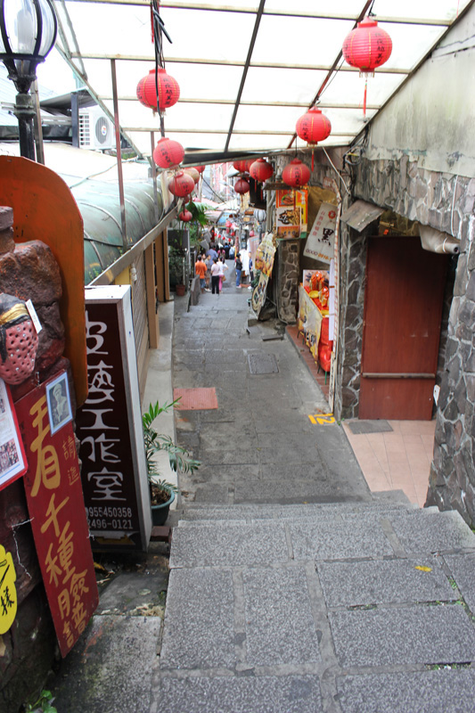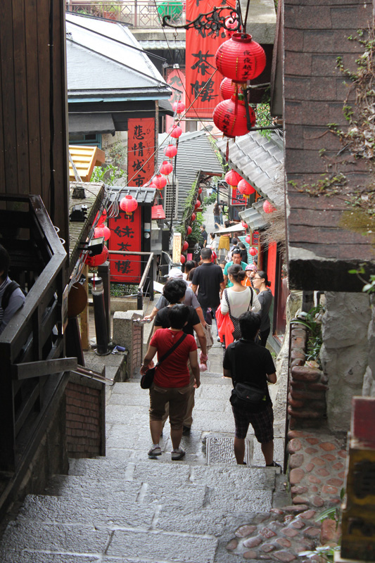 傘をさして、九份のメインストリートとなる、商店街を歩く。 千と千尋の神隠しの舞台になった街並み。 この映画は最初から最後までじっくりと見たことがないのだけど、なんとなく雰囲気はしっている。 赤を基調とした街並みと、階段や坂道が続く街並み。