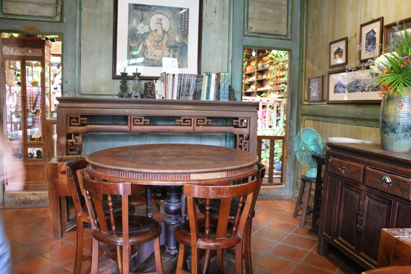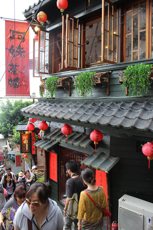 「九份茶房」というお店。 中は古い家具とかで構成されていて、テラス席もある。 が、外は満席だったので中に案内された。